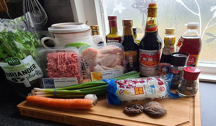 Verwijder de botjes uit de kippenvleugels (echt een heel leuk k..klusje). Marineer de uitgebeende vleugels in sojasaus, 2 tl donkere sojasaus en 1 tl suiker.
