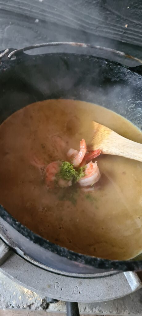 Laat de soep ongeveer 2 minuten koken, voeg dan de limoenrasp toe en doe de garnalen terug in de bouillon en laat dit nog even een paar minuten doorkoken.